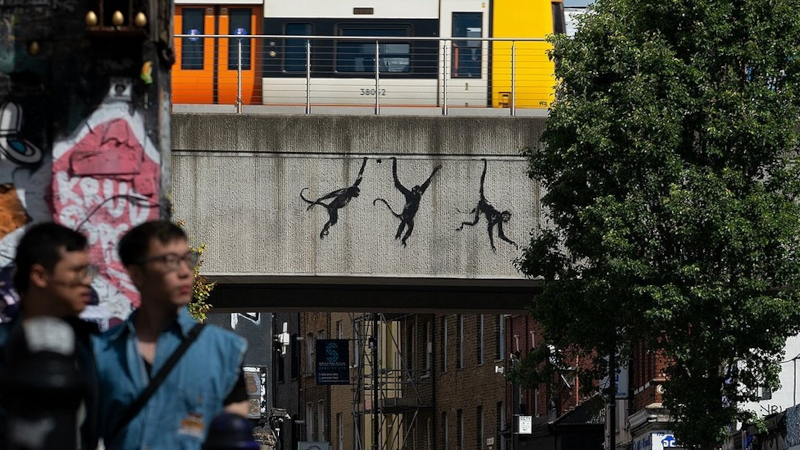 One by one, the animal images have been appearing across London. The earliest were a goat, “perched on a building buttress” and two hungry pelicans stealing fish from the sign for Bonners Fish Bar. A trio of monkeys swing along a vine-like feature of a train bridge.